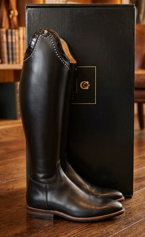 Ualmindelig smuk dressurstøvle med croco lak og sten