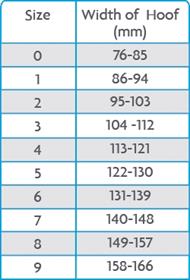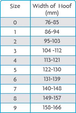 Mål bredden og længden på hoven og vælg den størrelse som passer bedst ifølge skemaet.
