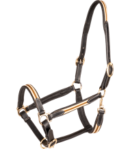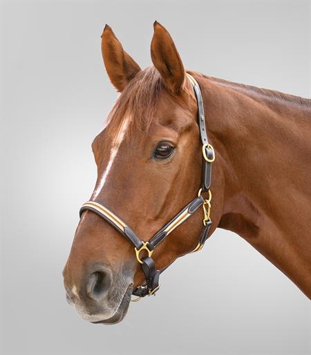 Blød lædergrime med dekorative stikninger og påsyet, sporty nylonrem på næsebånd, kæberem, nakkerem og sidestykker.